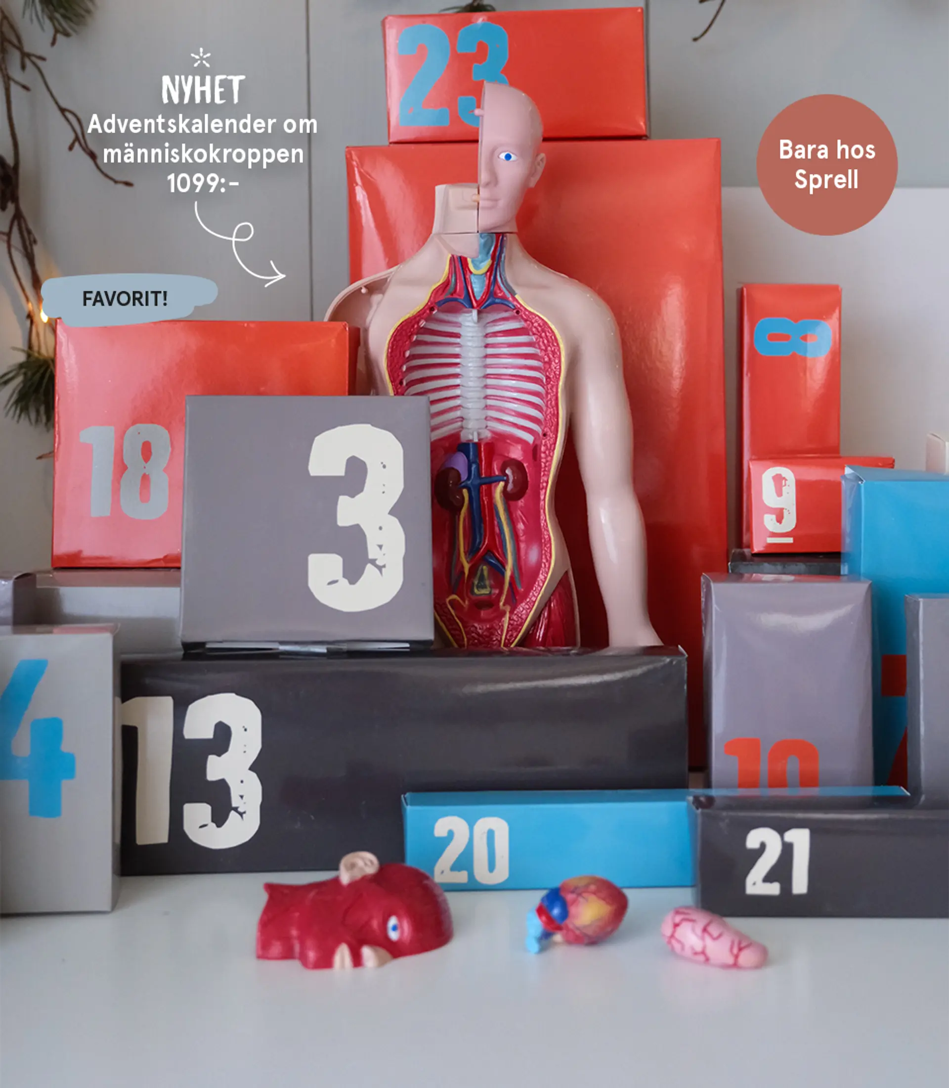 I den här kalendern lär du dig coola och nyttiga fakta om vår kropp och testar roliga experiment – bland annat att göra en fis!