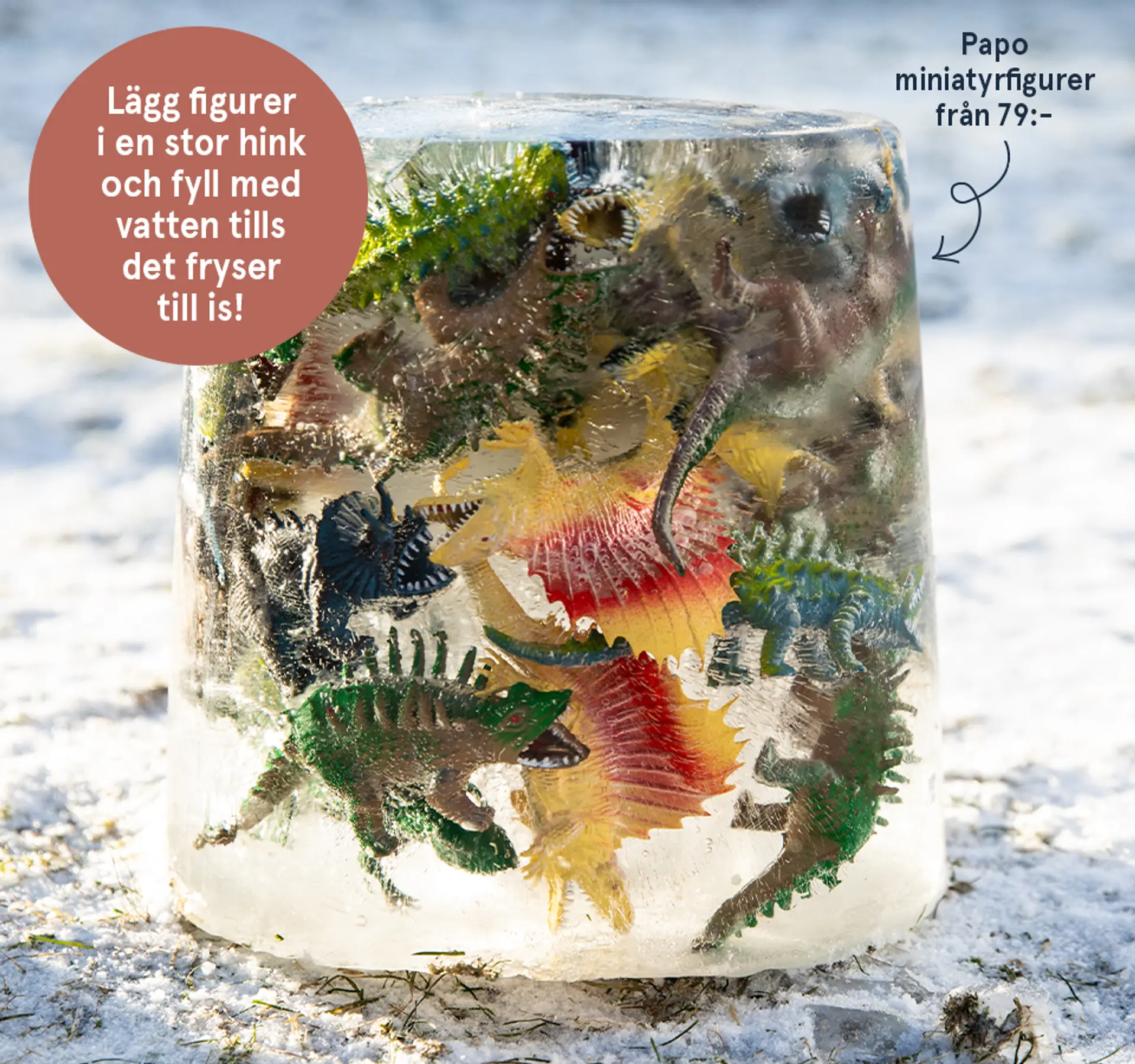 Fyll en behållare eller hink med vatten och lägg dinosaurierna i vattnet. Om du låter hinken stå ute över natten kommer vattnet att frysa till is och de små kan leka arkeologer! Det blir också en rolig dekoration för utomhuskalaset.
