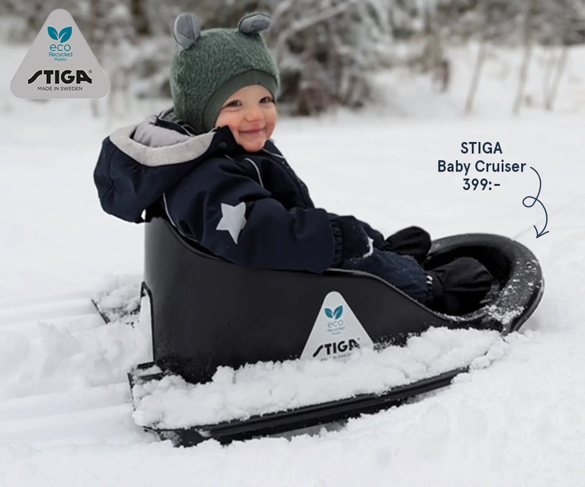 “Pulka för de minsta. Med hög rygg, bälte och dragsnöre. Tillverkad i ett miljövänligt material. Från 6 månader.